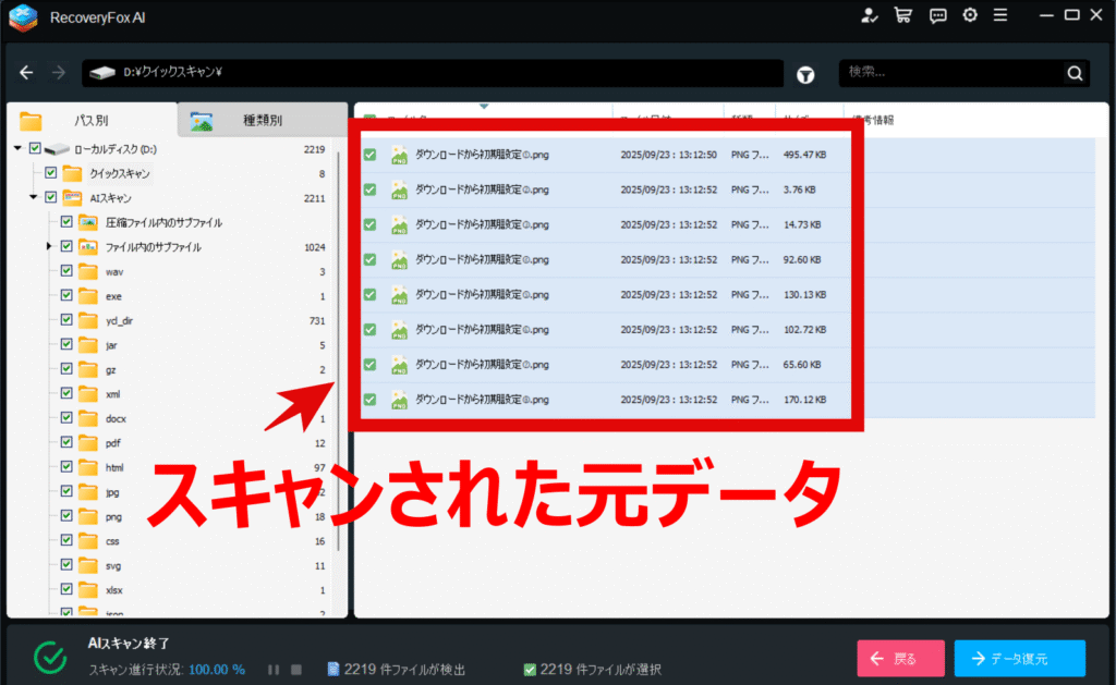 「RecoveryFox AI」は、AIを使用することで98%という驚異の復元率を誇っていますので、気になっている場合は、一度スキャンしてみてはいかがでしょうか。