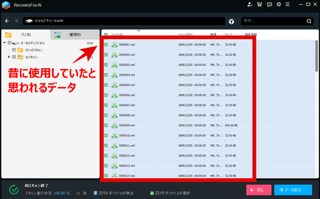 ⑧あとは、画面右下のデータ復元をクリックすると下記画面になります。