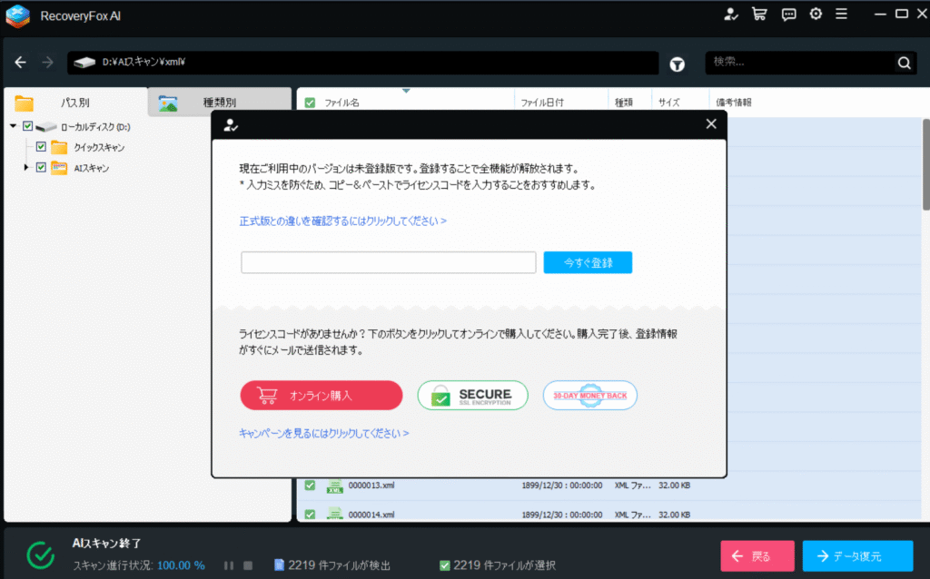 ですので、復元したいドライブをスキャンしたのちに表示されるプレビュー次第で、「RecoveryFox AI」を購入するかどうかを選択できます。