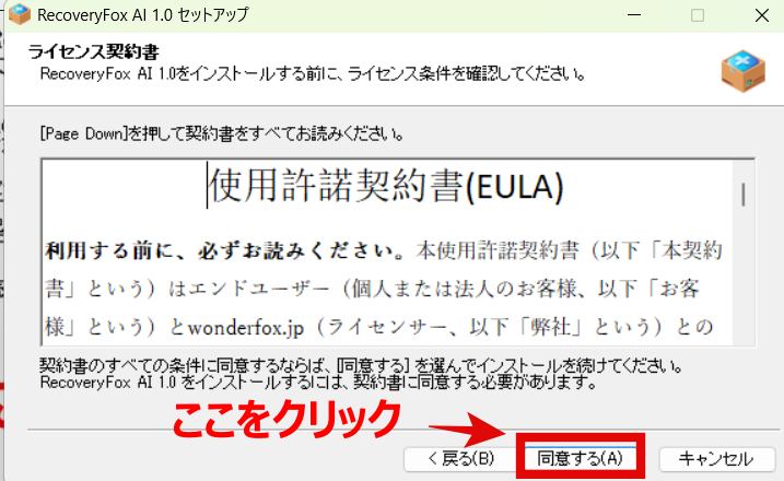 ⑥ソフトウェアお馴染みの契約書が表示されますので、全文を読んで「同意する」ボタンをクリックします。