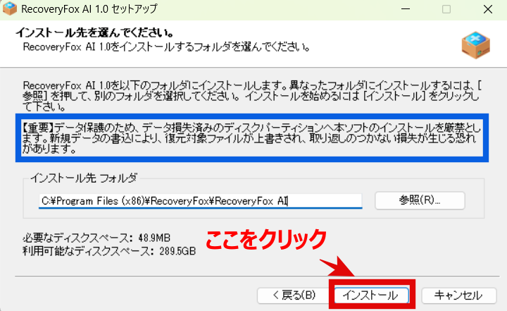 ※下記画像の青色内の文章を要約すると、「復元したいデータと同じドライブ内に保存しないでください」ということです。