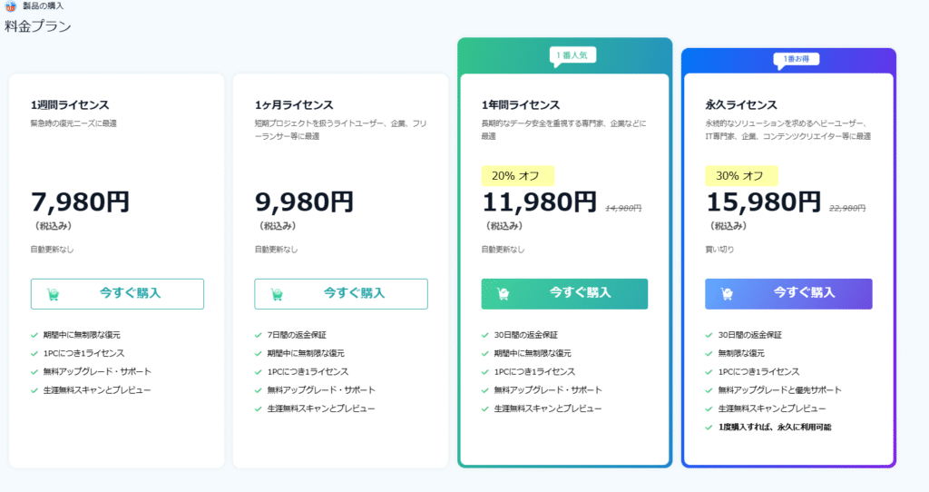実際にスキャンしてみて復旧出来そうだなと思った場合に「RecoveryFox AI」を購入することになるのですが、購入する際の金額が高ければ諦めてしまうこともあると思います。