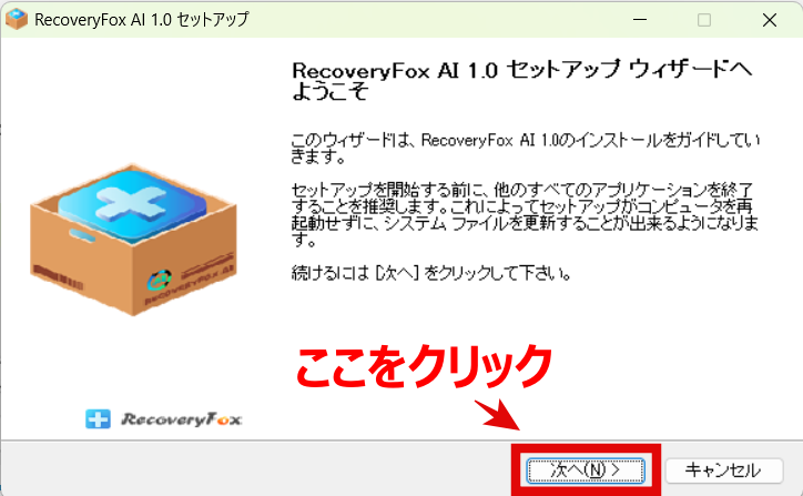 ⑤セットアップ画面が表示されるので「次へ」ボタンをクリックします。